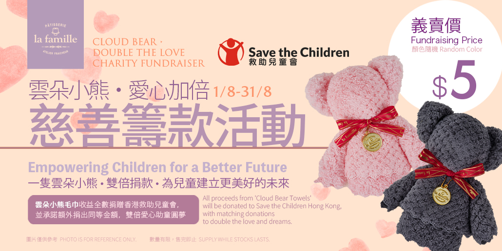 La Famille 將戚風蛋糕的柔軟特質轉化為公益行動,與「香港救助兒童會」攜手合作,推出「雲朵小熊 · 愛心加倍」慈善籌款活動。所有善款將用於支援香港及全球的兒童們在健康和安全的環境下成長。