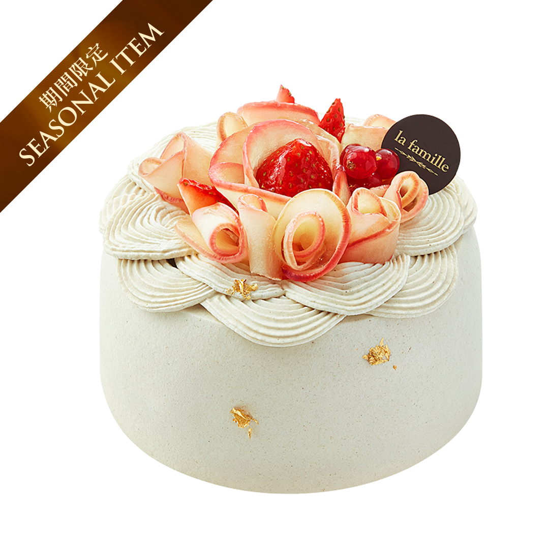 頂部以薄切青森蘋果堆疊成綻放的蘋果花,四周環繞著日本紅茶鮮忌廉擠花,綴以新鮮莓果。底部是塗滿日本紅茶鮮忌廉的鬆軟紅茶戚風蛋糕,中間夾著兩層內餡,上層是以楓糖漿慢煮而成的青森蘋果醬,下層則是柔滑細膩的蘋果慕絲。蘋果的清甜與紅茶的馥郁,交織出餘韻悠長的極致風味。