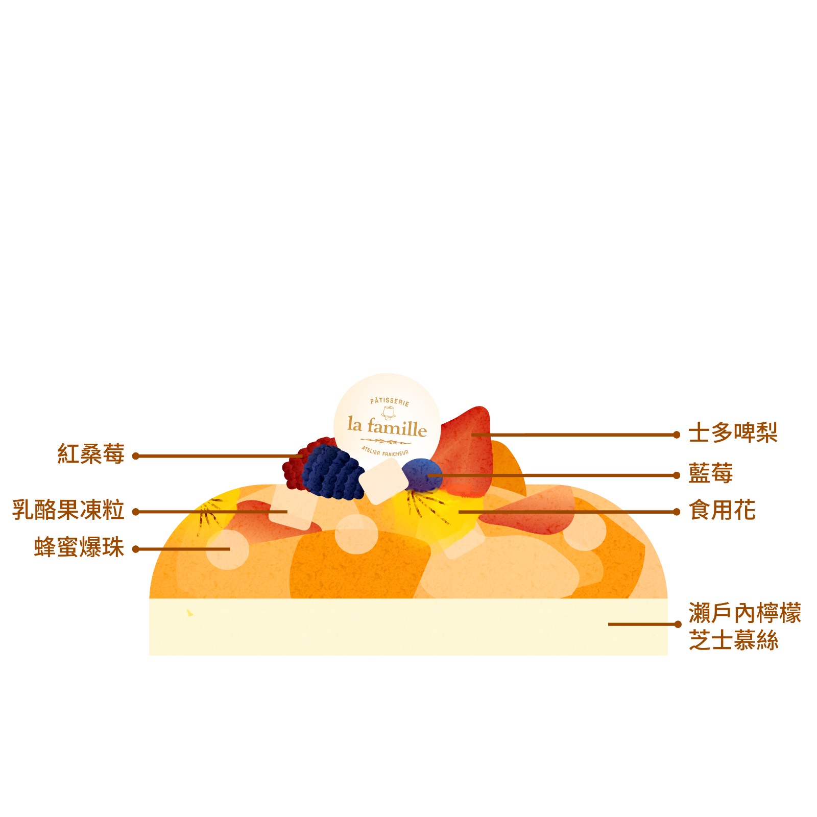 瀨戶內檸檬芝士慕絲, 士多啤梨, 乳酪果凍粒, 蜂蜜爆珠, 食用花, 藍莓, 紅桑莓